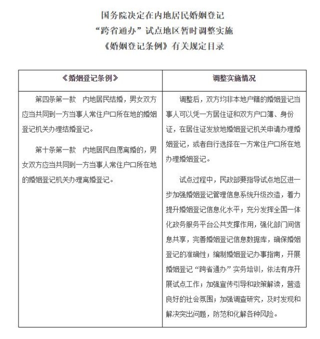 在試點(diǎn)地區(qū),相應(yīng)暫時(shí)調(diào)整實(shí)施《婚姻登記條例》第四條第一款、第十條第一款的有關(guān)規(guī)定(目錄附后)。調(diào)整后,雙方均非本地戶籍的婚姻登記當(dāng)事人可以憑一方居住證和雙方戶口簿、身份證,在居住證發(fā)放地婚姻登記機(jī)關(guān)申請(qǐng)辦理婚姻登記,或者自行選擇在一方常住戶口所在地辦理婚姻登記。