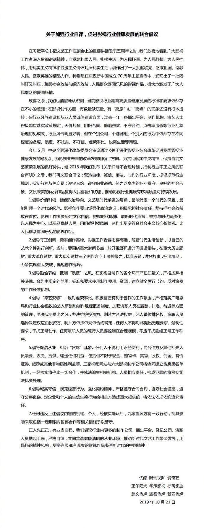 為了避免娛樂圈的爭番、攀比等亂象,業(yè)界公司曾聯(lián)合發(fā)布自律倡議。2019年,優(yōu)酷、騰訊視頻、愛奇藝三家視頻網站,聯(lián)合正午陽光、華策影視、檸萌影業(yè)、慈文傳媒、耀客傳媒、新麗傳媒六大影視制作公司,共同發(fā)布《關于加強行業(yè)自律,促進影視行業(yè)健康發(fā)展的聯(lián)合倡議》。