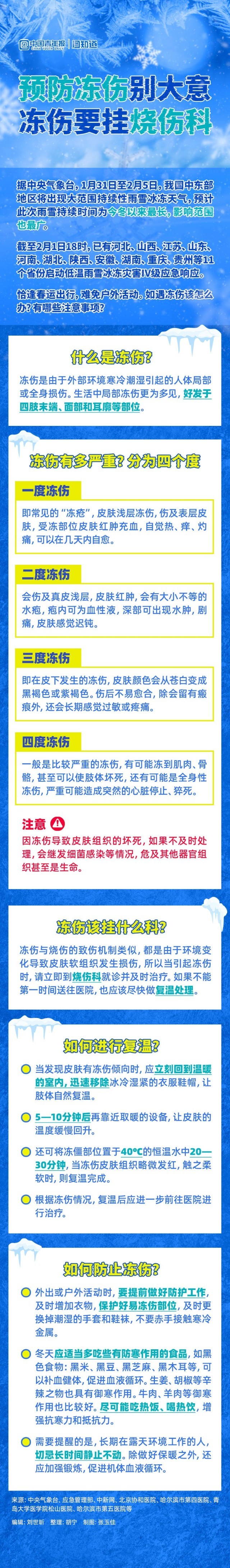 2月1日,中央氣象臺(tái)發(fā)布冰凍橙色預(yù)警。據(jù)預(yù)報(bào),這是2009年以來(lái)冬季最強(qiáng)雨雪冰凍天氣,預(yù)計(jì)將持續(xù)6天,10省份將出現(xiàn)暴雪或大暴雪。恰逢春運(yùn)出行,在旅途中也要謹(jǐn)防凍傷。如遇凍傷該怎么辦?如何緊急補(bǔ)救?想要就醫(yī)該掛什么科室?轉(zhuǎn)發(fā)收藏,祝福大家平安祥和迎春到,開(kāi)心順利過(guò)大年。