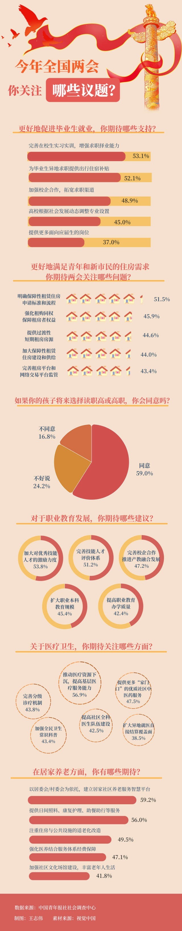 全國兩會時間開啟,哪些議題牽動著大家的心?全國兩會前夕,中青報社調(diào)中心進(jìn)行的一項調(diào)查顯示,就業(yè)、教育、醫(yī)療、住房等民生議題頗受關(guān)注。今年全國兩會,你關(guān)注哪些議題?
