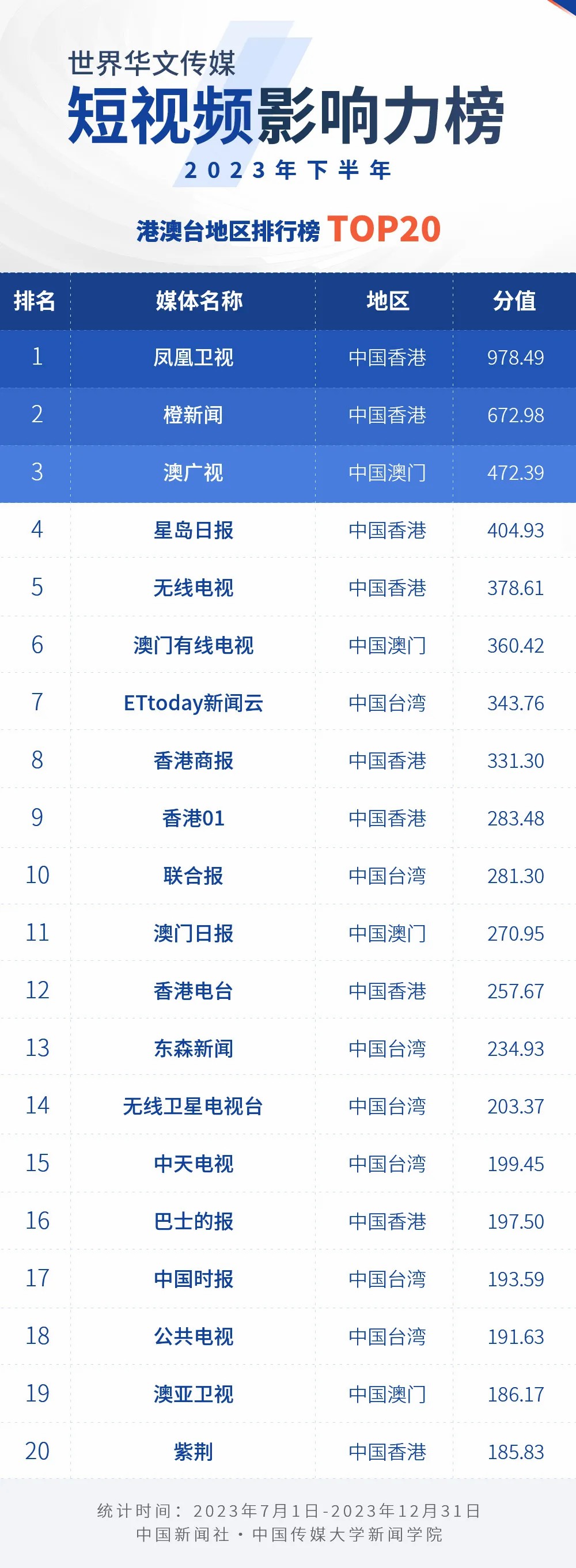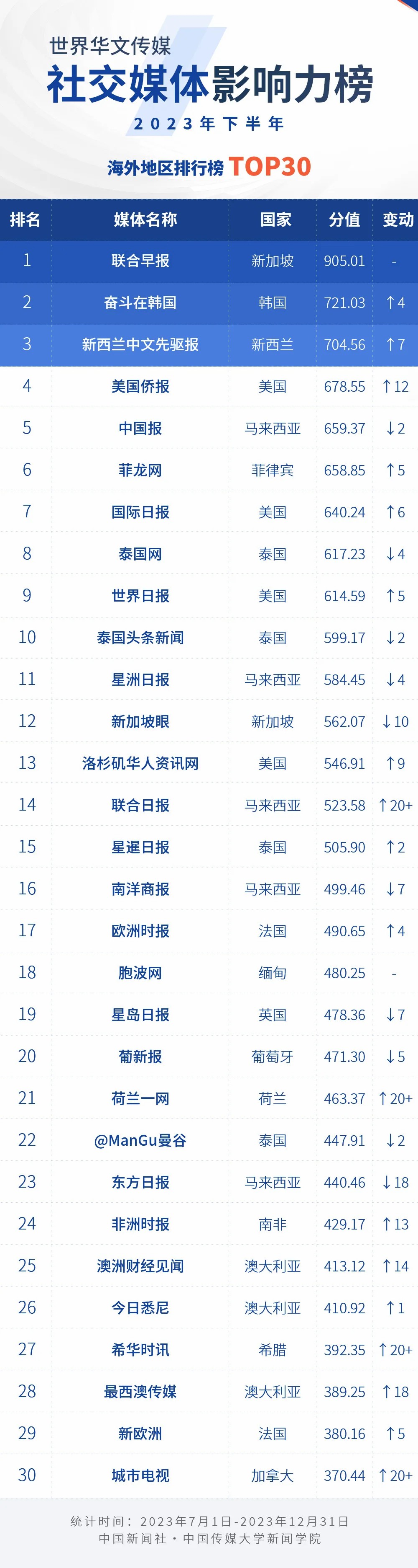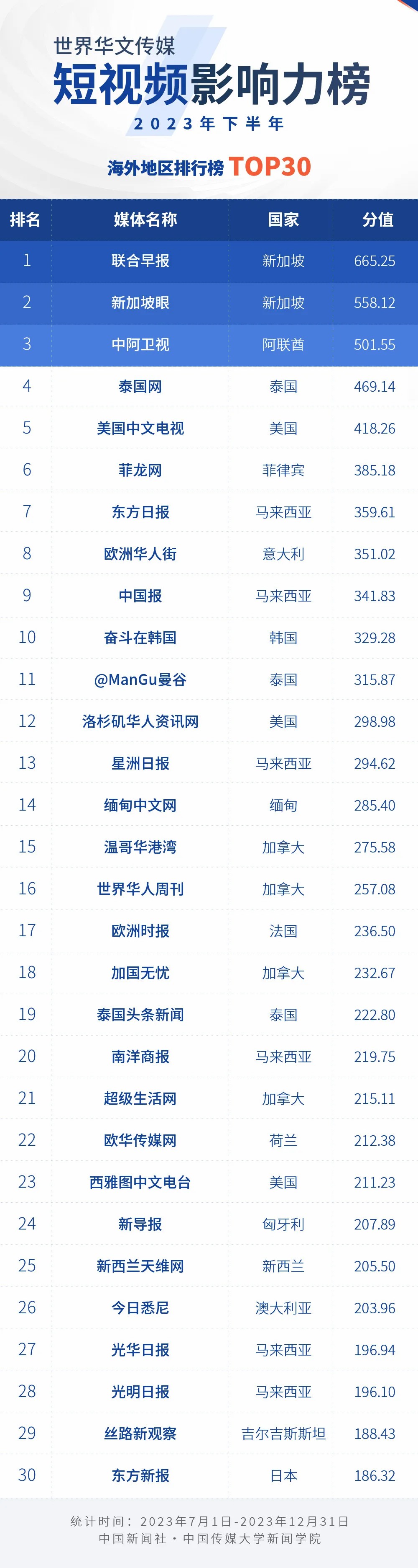 中國新聞社與中國傳媒大學新聞學院持續(xù)開展“世界華文傳媒新媒體影響力”測評項目,現根據2023年下半年世界華文傳媒新媒體的業(yè)務數據,發(fā)布2023年下半年榜。