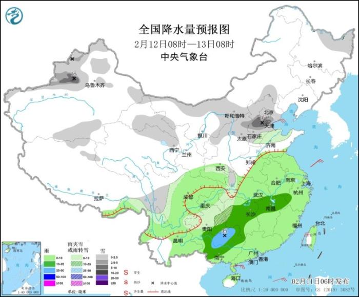 2月12日8時至13日8時,新疆伊犁河谷和南疆盆地、西藏北部、青海北部、甘肅河西、內蒙古中西部、黑龍江北部、陜西北部、華北大部、川西高原南部等地部分地區(qū)有小到中雪,其中,新疆伊犁河谷、河北中部、天津中部等地部分地區(qū)有大雪,局地有暴雪(10~15毫米)。黃淮大部、江淮、江漢大部、江南、西南地區(qū)東部和南部、華南、臺灣島等地部分地區(qū)有小到中雨,其中,廣西北部等地部分地區(qū)有大雨(25~45毫米)。