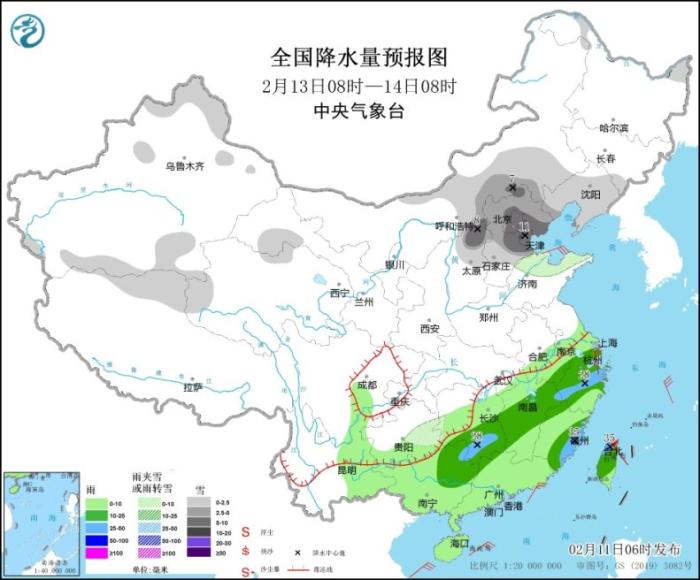 2月13日8時至14日8時,新疆北部和南疆盆地、西藏北部、青海西部和北部、甘肅河西、內蒙古中部、東北地區(qū)南部、華北大部等地部分地區(qū)有小到中雪,其中,山西北部、河北中北部、北京、天津等地部分地區(qū)有大到暴雪(10~11毫米)。江淮西部、江南大部、西南地區(qū)東南部、華南、臺灣島等地部分地區(qū)有小到中雨,其中,湖南南部、浙江中部、福建東南部、廣西東北部、臺灣島北部等地部分地區(qū)有大雨(25~35毫米)。