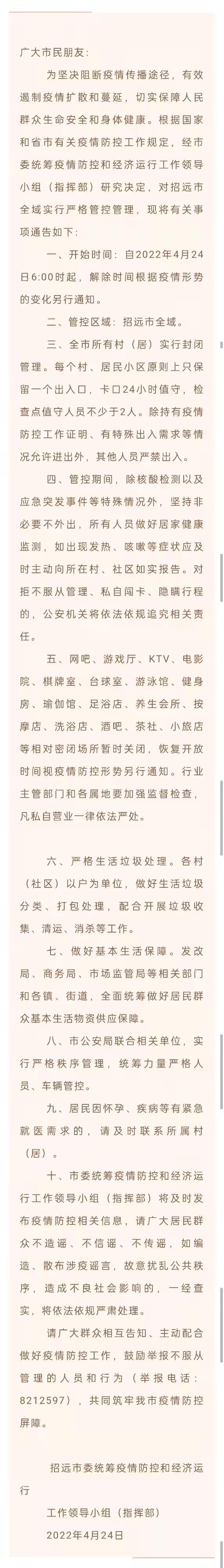 4月24日,山東煙臺招遠市委統(tǒng)籌疫情防控和經(jīng)濟運行工作領(lǐng)導(dǎo)小組(指揮部)發(fā)布《關(guān)于全域?qū)嵤﹪栏窆芸毓芾淼耐ǜ妗?。通告指出,?022年4月24日6時起,招遠市所有村(居)實行封閉管理。每個村、居民小區(qū)原則上只保留一個出入口,卡口24小時值守,檢查點值守人員不少于2人。除持有疫情防控工作證明、有特殊出入需求等情況允許進出外,其他人員嚴禁出入。