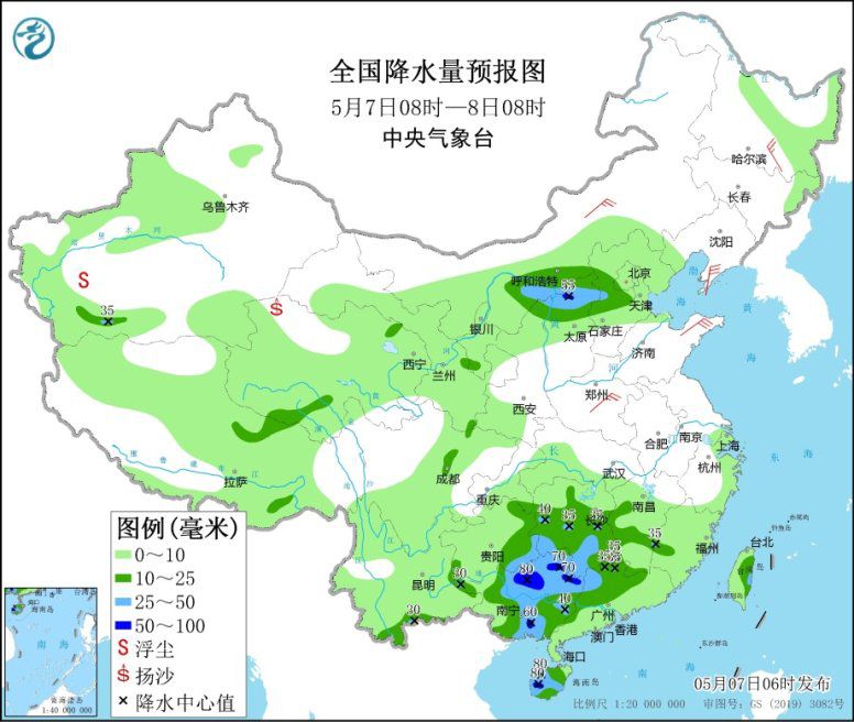 5月7日08時至8日08時,內(nèi)蒙古河套地區(qū)、陜西北部、山西北部、河北西部、重慶東南部、貴州東部和南部、云南東部和南部、湖南中南部、江西南部、廣西、廣東北部和西部、海南島等地的部分地區(qū)有中到大雨,其中,山西北部、廣西北部和東南部、海南島中西部等地局地暴雨(50~90毫米)。內(nèi)蒙古、西北地區(qū)東部、東北地區(qū)北部和南部、華北北部和西部、黃淮大部、江南東部、西藏中北部等地的部分地區(qū)有4~6級風(見圖1);渤海、渤海海峽有6~7級、陣風8級的偏北風。