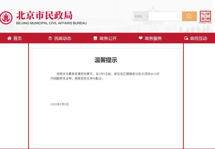 中新網(wǎng)5月6日電 據(jù)北京市民政局網(wǎng)站消息,按照北京市最新疫情防控要求,自5月5日起,前往各區(qū)婚姻登記機(jī)關(guān)須持48小時(shí)內(nèi)核酸陰性證明。