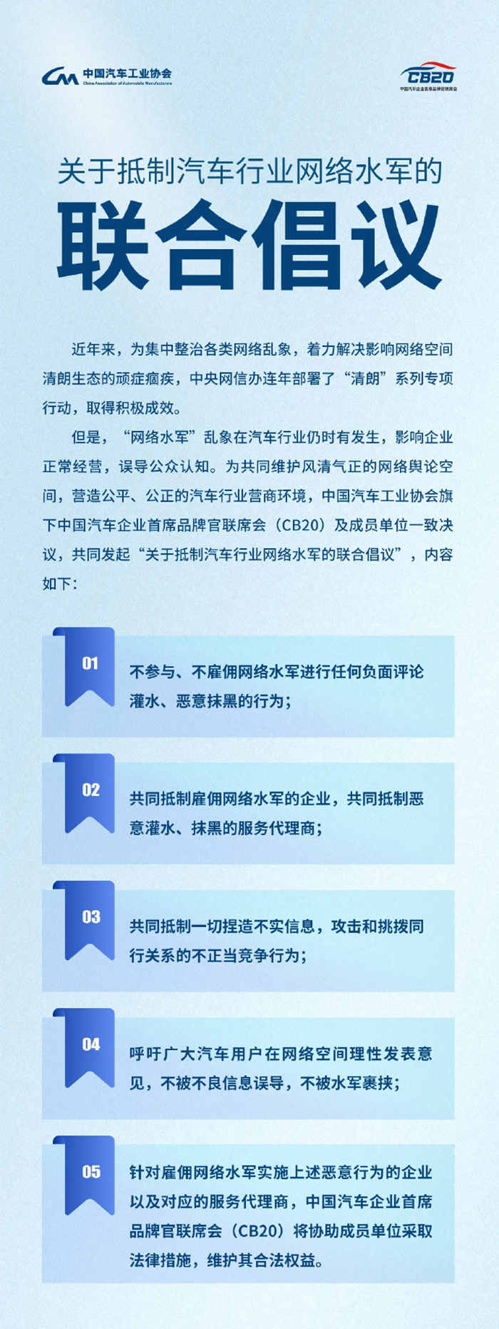 中新網(wǎng)3月24日電(中新財(cái)經(jīng) 葛成) 24日,中新財(cái)經(jīng)從中汽協(xié)獲悉,為共同維護(hù)風(fēng)清氣正的網(wǎng)絡(luò)輿論空間,營造公平、公正的汽車行業(yè)營商環(huán)境,中國汽車工業(yè)協(xié)會(huì)旗下中國汽車企業(yè)首席品牌官聯(lián)席會(huì)(CB20)及成員單位一致決議,共同發(fā)起“關(guān)于抵制汽車行業(yè)網(wǎng)絡(luò)水軍的聯(lián)合倡議”。
