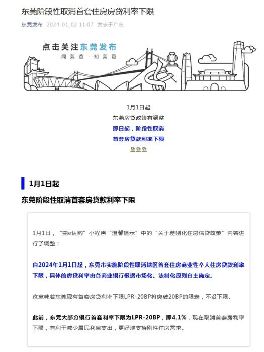中新網1月2日電 據“東莞發(fā)布”微信公眾號消息,自2024年1月1日起,廣東省東莞市實施階段性取消轄區(qū)首套住房商業(yè)性個人住房貸款利率下限,具體的房貸利率由各商業(yè)銀行根據市場化、法制化原則自主確定。這意味著東莞現有首套房貸利率下限LPR-20BP將突破20BP的限定,不設下限。