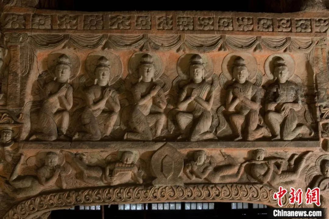 云岡石窟第12窟又名“音樂窟”,前殿上壁雕塑的數(shù)十身伎樂天人形象正在演奏琵琶、篳篥、古琴等各種中西式樂器,是中國古代最早的宮廷交響樂團。武俊杰 攝