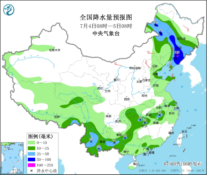 中新網(wǎng)7月4日電 據(jù)中央氣象臺(tái)網(wǎng)站消息,中央氣象臺(tái)今晨繼續(xù)發(fā)布暴雨藍(lán)色預(yù)警:預(yù)計(jì)今明兩天,東北地區(qū)及內(nèi)蒙古東北部將成強(qiáng)降雨主陣地,其中今天白天至夜間,內(nèi)蒙古東北部、黑龍江西南部、吉林、遼寧中東部等地部分地區(qū)有大到暴雨,遼寧東北部等局地有大暴雨(100~120毫米);上述部分地區(qū)伴有短時(shí)強(qiáng)降水(最大小時(shí)降雨量20~50毫米,局地可超過(guò)60毫米),局地有雷暴大風(fēng)等強(qiáng)對(duì)流天氣。明天,內(nèi)蒙古東北部、黑龍江大部、吉林北部有中到大雨,局地暴雨。受強(qiáng)降雨影響,內(nèi)蒙古東北部、東北部分地區(qū)等地有暴雨災(zāi)害中高風(fēng)險(xiǎn),關(guān)注局地可能發(fā)生的山洪、地質(zhì)災(zāi)害和城鄉(xiāng)積澇,并防范強(qiáng)對(duì)流天氣的危害。