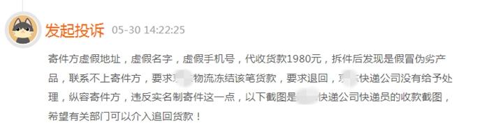 記者也注意到,在黑貓投訴平臺(tái)上就有消費(fèi)者投訴稱,“寄件方是虛假地址、虛假名字、虛假手機(jī)號(hào)”,快遞平臺(tái)代收貨款1980元,拆件后發(fā)現(xiàn)是假冒偽劣產(chǎn)品,聯(lián)系不上寄件方,要求快遞公司凍結(jié)該筆貨款并退回,快遞公司沒有給予處理。