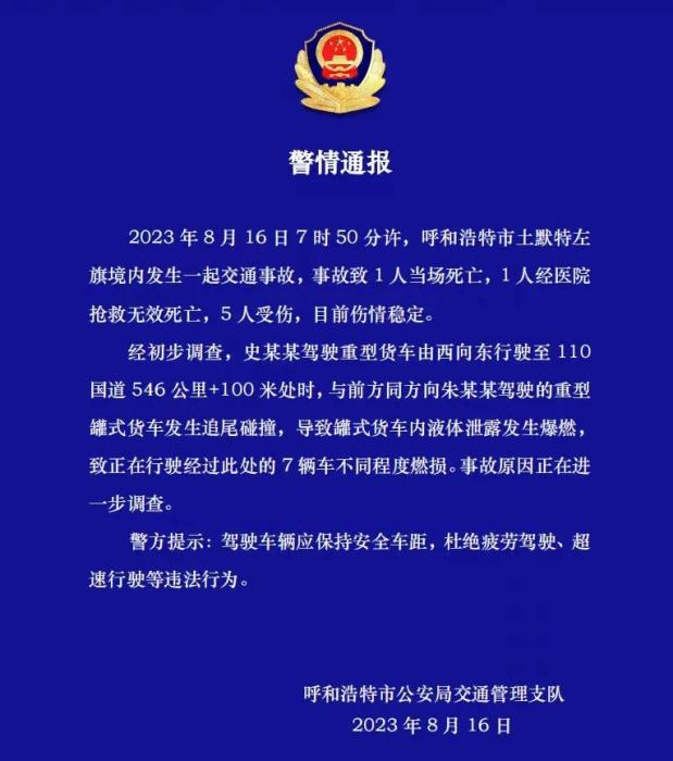 中新網8月16日電 據內蒙古呼和浩特市公安局官方微信消息,呼和浩特市公安局交通管理支隊16日發(fā)布警情通報稱,8月16日7時50分許,呼和浩特市土默特左旗境內發(fā)生一起交通事故,事故致1人當場死亡,1人經醫(yī)院搶救無效死亡,5人受傷,目前傷情穩(wěn)定。