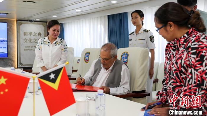 9月3日上午,正在執(zhí)行“和諧使命-2023”任務(wù)的中國(guó)海軍“和平方舟”號(hào)醫(yī)院船抵達(dá)東帝汶帝力港,開始為期7天的友好訪問(wèn)和醫(yī)療服務(wù)。圖為東帝汶總統(tǒng)奧爾塔在醫(yī)院船簽名簿上留言。黎宇 攝