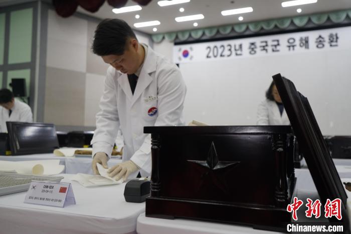 當(dāng)?shù)貢r(shí)間11月22日上午,第十批在韓中國人民志愿軍烈士遺骸裝殮儀式在韓國舉行。圖為韓方工作人員對志愿軍烈士遺骸進(jìn)行裝殮。中新社記者 劉旭 攝