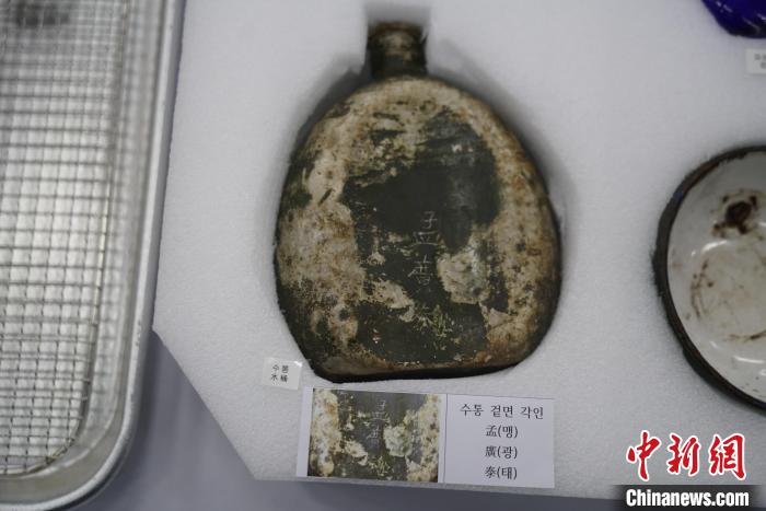 當(dāng)?shù)貢r(shí)間11月22日上午,第十批在韓中國人民志愿軍烈士遺骸裝殮儀式在韓國舉行。圖為裝殮儀式現(xiàn)場拍攝的寫有“孟廣泰”名字的水壺。中新社記者 劉旭 攝