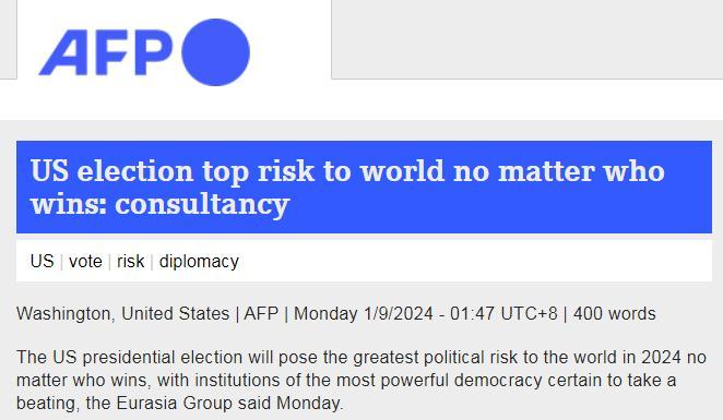 中新網(wǎng)1月10日電 據(jù)法新社報道,日前,政治風(fēng)險咨詢公司歐亞集團表示,無論誰獲勝,2024年美國總統(tǒng)選舉都將給世界帶來最大政治風(fēng)險,美國制度將會受到打擊。