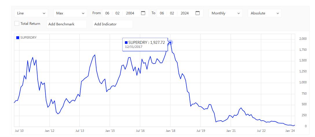 值得一提的是,倫敦證券交易所網(wǎng)站顯示,Superdry的股價曾在2017年年底達(dá)到過1927.72便士/股。