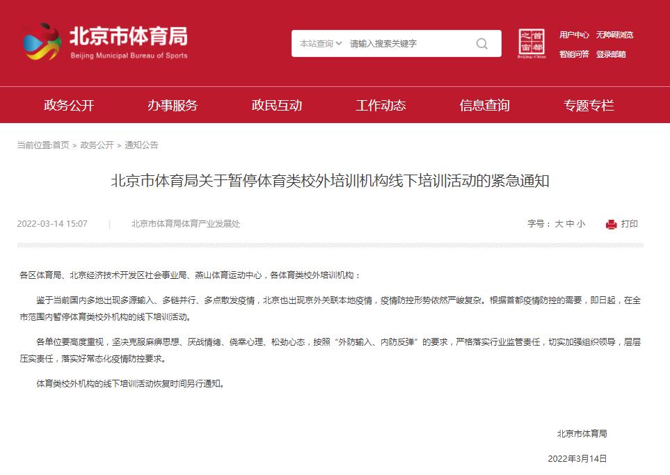北京:全市范圍內(nèi)暫停體育類校外機(jī)構(gòu)的線下培訓(xùn)活動