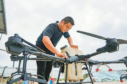中江縣金穗源糧食專業(yè)合作社理事長常滔在做無人機(jī)起飛前的準(zhǔn)備工作。四川日報全媒體記者 李強(qiáng) 攝