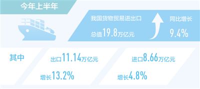 本報(bào)北京7月13日電 (記者杜海濤)據(jù)海關(guān)統(tǒng)計(jì),今年上半年我國(guó)貨物貿(mào)易進(jìn)出口總值19.8萬(wàn)億元,同比增長(zhǎng)9.4%。其中,出口11.14萬(wàn)億元,增長(zhǎng)13.2%;進(jìn)口8.66萬(wàn)億元,增長(zhǎng)4.8%。