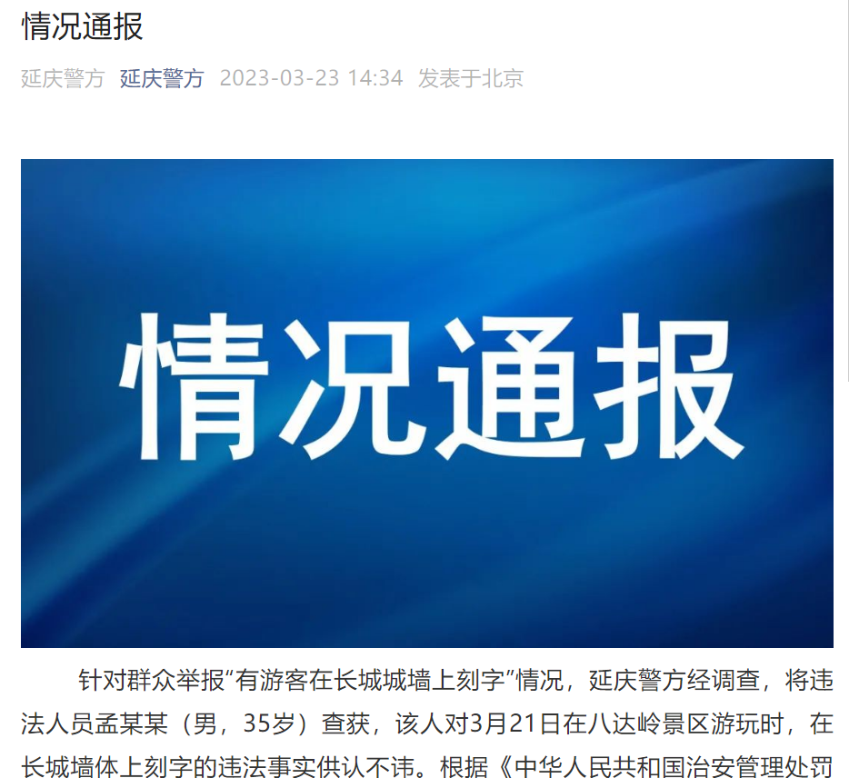 央廣網北京3月23日消息 據延慶警方微信公眾號3月23日情況通報, 針對群眾舉報“有游客在長城城墻上刻字”情況,延慶警方經調查,將違法人員孟某某(男,35歲)查獲,該人對3月21日在八達嶺景區(qū)游玩時,在長城墻體上刻字的違法事實供認不諱。根據《中華人民共和國治安管理處罰法》有關規(guī)定,延慶警方已對孟某某處以行政拘留并處罰款的處罰。