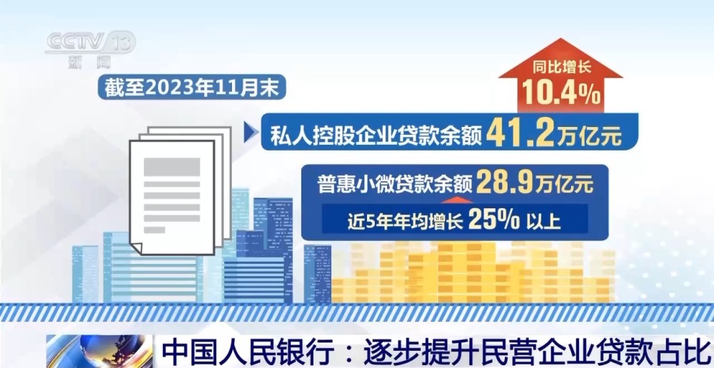 在信貸政策方面,開展中小微企業(yè)金融服務(wù)能力提升工程,完善金融服務(wù)體系,增強民營貸款的穩(wěn)定性。截至2023年11月末,私人控股企業(yè)貸款余額41.2萬億元,同比增長10.4%;普惠小微貸款余額28.9萬億元,近5年年均增長25%以上。