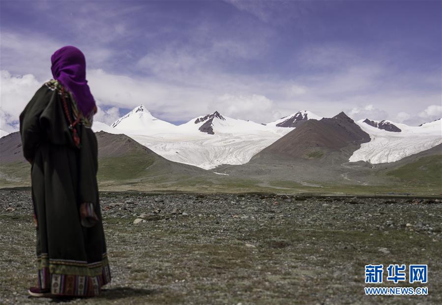 8月15日,牧民在雪山腳下遠(yuǎn)眺崗加曲巴冰川。 位于青海省玉樹藏族自治州的崗加曲巴冰川,坐落于長江源園區(qū)的各拉丹冬雪山東坡,從空中俯瞰,層疊的冰塔顯得尤為壯觀。 新華社記者 吳剛 攝