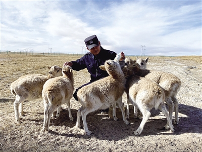 可可西里巡山隊(duì)員鄧海平給藏羚羊幼仔喂奶。新華社記 者王金金 攝