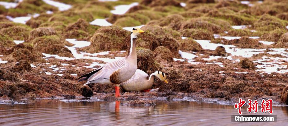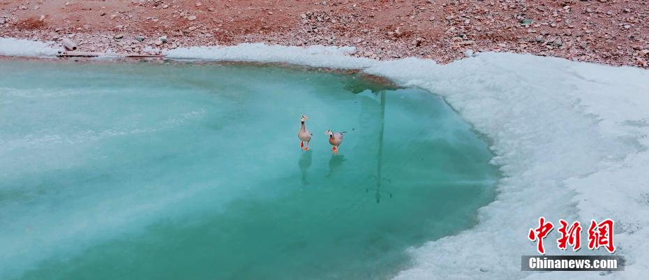 立夏以來(lái),在位于祁連山國(guó)家公園內(nèi)的青海省海北藏族自治州祁連縣,當(dāng)?shù)孛癖娕臄z到多種野生動(dòng)物活動(dòng)影像。圖為斑頭雁在冰面行走。