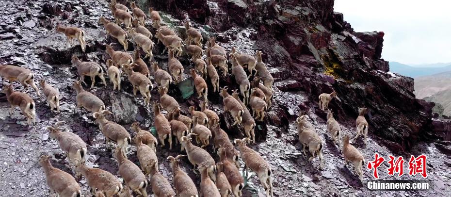 在青藏高原,春夏季氣溫較東部地區(qū)低,由于海拔較高,祁連山頂積雪常年不化。雖然近日降溫,但野生動(dòng)物已感受到夏日來(lái)臨。圖為正在爬山的巖羊群。 馬志原 攝