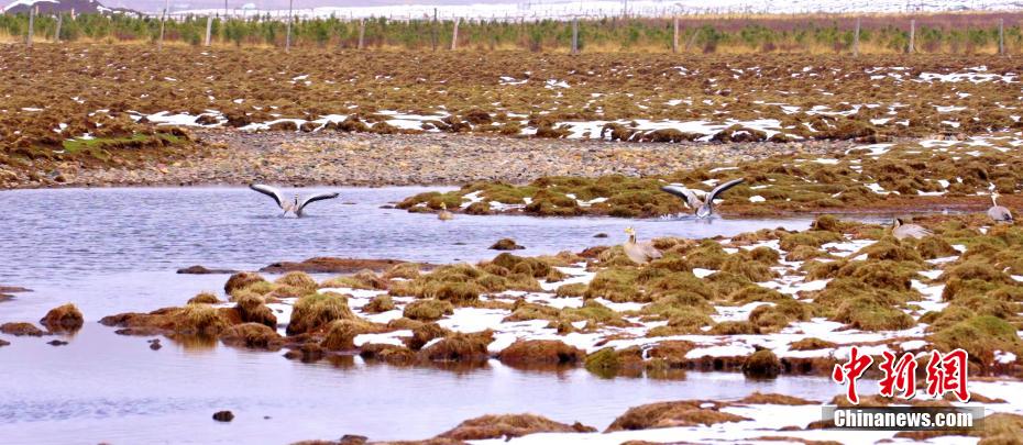 圖為斑頭雁等鳥(niǎo)類(lèi)在濕地飛舞覓食。馬志原 攝