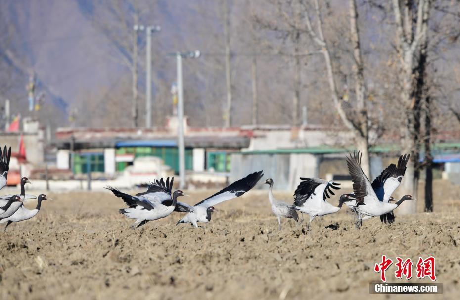 每年的10月底,成群的黑頸鶴飛到西藏拉薩市林周縣越冬,在拉薩市林周縣周邊的湖泊濕地度過(guò)5個(gè)月的“閑云野鶴”生活,次年三四月份再飛向藏北草原繁殖。黑頸鶴是世界上唯一一種高原鶴類。具有足長(zhǎng)、喙長(zhǎng)、頸長(zhǎng)的典型涉禽類特征,適合在沼澤地里行走。黑頸鶴的頸、尾為黑色,體羽為灰白色。黑頸鶴是國(guó)家一級(jí)保護(hù)動(dòng)物。目前,每年到林周縣越冬的黑頸鶴已達(dá)2000只左右。圖為黑頸鶴在林周境內(nèi)的農(nóng)田里飛翔。 貢嘎來(lái)松 攝