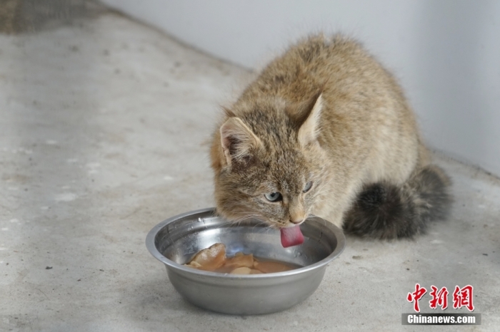 圖為1月18日,在青海省祁連山國(guó)家公園野生動(dòng)物救護(hù)繁育站內(nèi),一只荒漠貓正在進(jìn)食。 中新社記者 馬銘言 攝