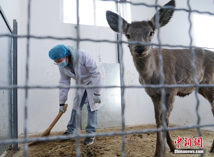 圖為1月18日,青海省祁連山國(guó)家公園野生動(dòng)物救護(hù)繁育站工作人員徐豐奕正在打掃西藏馬鹿的籠舍。 中新社記者 馬銘言 攝