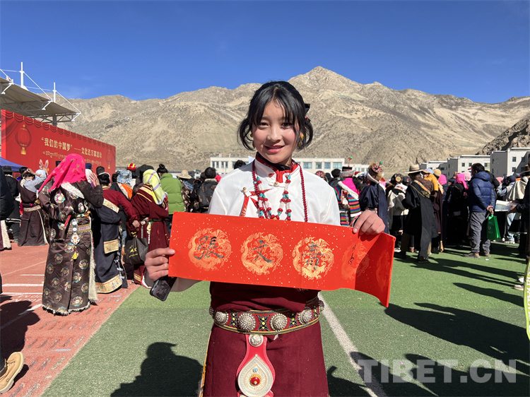 來到送“書法”現(xiàn)場,書法家們早早地來到活動現(xiàn)場,他們準備筆墨、鋪開紙張,為現(xiàn)場群眾書寫藏、漢文新年對聯(lián),“?!弊?、“吉祥如意”、“扎西德勒”等寓意美好的祝福。書法家協(xié)會副主席祖牛拉巴次仁說:“從春節(jié)開始,我們書法家們?nèi)W校、社區(qū)、搬遷安置點等地,書寫了超過1萬件的書法作品。這些作品深受大家的喜愛,我們后續(xù)也會繼續(xù)開展送‘書法’公益活動”?,F(xiàn)場群眾聚集在送“書法”現(xiàn)場,“西熱措姆”“張文青”“索朗旺青”“朗嘎達瓦”……孩子們爭先恐后請書法家把自己的名字寫在紅紙上?!斑@是我的名字,我爸是西寧人,我媽是那曲的,我們是從那曲安多縣搬遷過來的,我現(xiàn)在在森布日幸福中學上初三,將來要考那曲高級中學”張文青拿著書家贈給她的“名字”用流利的那曲話對記者說。