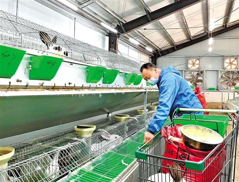 圖為拉薩市曲水縣才納鄉(xiāng)四季吉祥村獺兔養(yǎng)殖場的工人給兔子喂料。記者 旦增蘭澤 攝