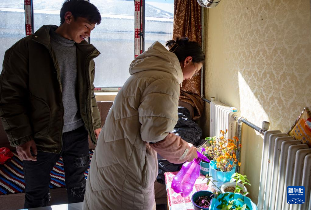 距離太陽能集熱場約3公里外的縣職工周轉(zhuǎn)房小區(qū)是供暖工程的最遠(yuǎn)端,年輕夫妻曲珠(左)和央次仁在家中侍弄花草(1月6日攝)。新華社記者 姜帆 攝