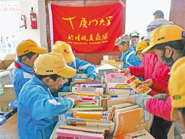 圖為廈門大學竹蜻蜓支教隊在當雄縣龍仁鄉(xiāng)中心小學舉辦流動圖書館活動。通訊員 黃宇霞 高捷 何春雨 崔慶煒