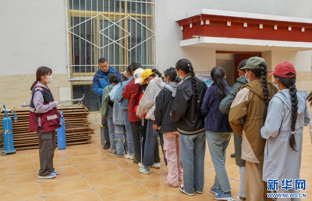 4日上午,在那曲市色尼區(qū)尼瑪鄉(xiāng)小學學生宿舍一樓大廳,學生們齊刷刷排成隊等待做心臟聽診?!奥犜\有問題的同學,由老師帶去做心臟彩超。”領(lǐng)隊醫(yī)生耿直一邊吸氧一邊聽診。