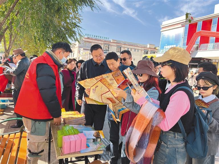 圖為工作人員向游客介紹拉薩旅游景點相關(guān)情況。記者 央金 攝