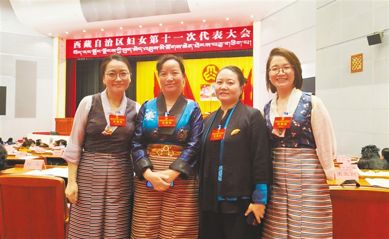 圖為卓瑪(左一)參加西藏自治區(qū)婦女第十一次代表大會(huì)時(shí)與其他代表合影。