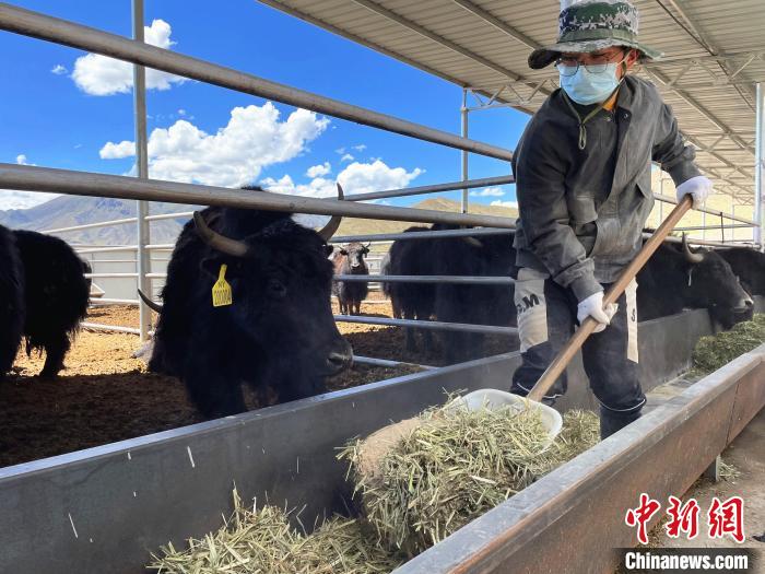 圖為拉薩市林周縣格桑塘現(xiàn)代農(nóng)牧業(yè)產(chǎn)業(yè)示范園內(nèi),工作人員為牦牛準(zhǔn)備飼料?!∪轿木?攝