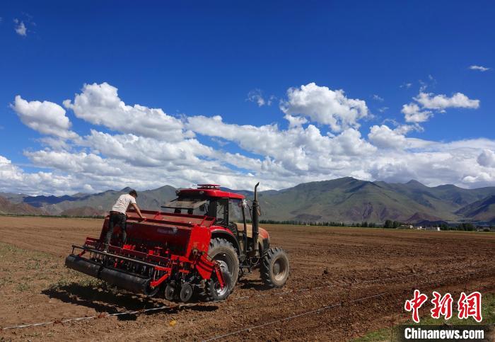 圖為拉薩市林周縣曲嘎強村正在播種燕麥飼草?!∪轿木?攝