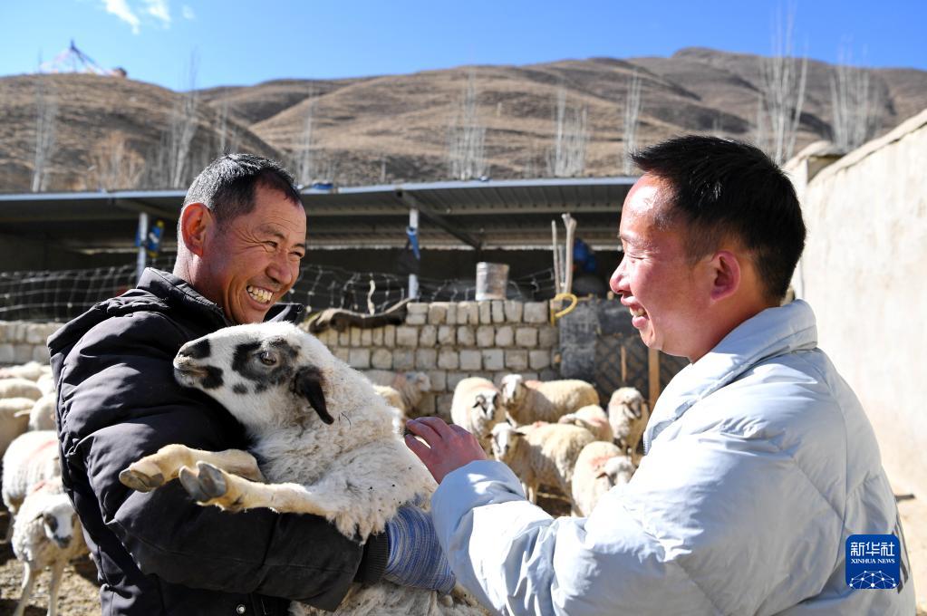 西卡學(xué)村養(yǎng)殖合作社負(fù)責(zé)人邊覺(jué)(左)在向西卡學(xué)村黨總支第一書(shū)記兼駐村工作隊(duì)副隊(duì)長(zhǎng)李德林介紹綿羊養(yǎng)殖及銷售情況(4月5日攝)。新華社記者 張汝鋒 攝
