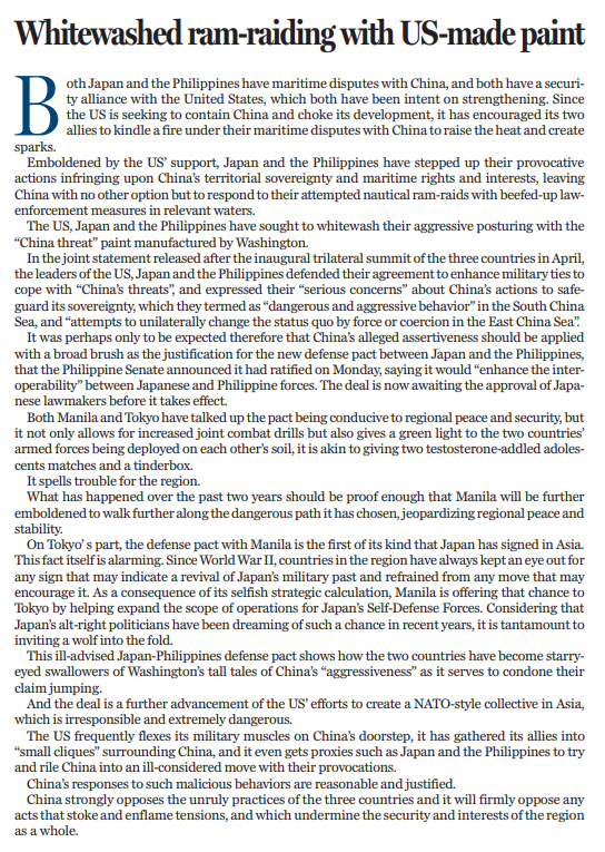今年4月,美日菲三國(guó)領(lǐng)導(dǎo)人在首次三邊峰會(huì)后發(fā)表聯(lián)合聲明,為三國(guó)加強(qiáng)軍事關(guān)系以應(yīng)對(duì)“中國(guó)威脅”的協(xié)議辯護(hù),并對(duì)中國(guó)為維護(hù)主權(quán)而采取的行動(dòng)表示“嚴(yán)重關(guān)切”,稱中國(guó)在南海采取“危險(xiǎn)且具侵略性的行為”,還指責(zé)中國(guó)“試圖在東海以武力或脅迫手段單方面改變現(xiàn)狀”。