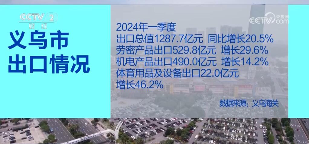 數(shù)據(jù)顯示,2024年一季度,義烏市出口總值達(dá)1287.7億元,同比增長(zhǎng)20.5%。其中,勞密產(chǎn)品出口529.8億元,增長(zhǎng)29.6%;機(jī)電產(chǎn)品出口490.0億元,增長(zhǎng)14.2%;而體育用品及設(shè)備出口達(dá)到22.0億元,增長(zhǎng)46.2%。業(yè)內(nèi)人士表示,巴黎奧運(yùn)會(huì)即將召開,以及外商圣誕采購季開始,歐美市場(chǎng)補(bǔ)庫存需求增加,使得相關(guān)產(chǎn)品出口占比顯著提升。