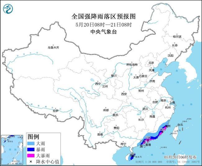 預(yù)計(jì),5月20日08時(shí)至21日08時(shí),廣東中東部、福建東部、海南島中東部等地部分地區(qū)有大到暴雨,其中,廣東南部沿海、福建東南部等地部分地區(qū)有大暴雨(100~150毫米)。上述部分地區(qū)伴有短時(shí)強(qiáng)降水(最大小時(shí)降雨量20~50毫米,局地可超過60毫米),局地有雷暴大風(fēng)等強(qiáng)對(duì)流天氣。