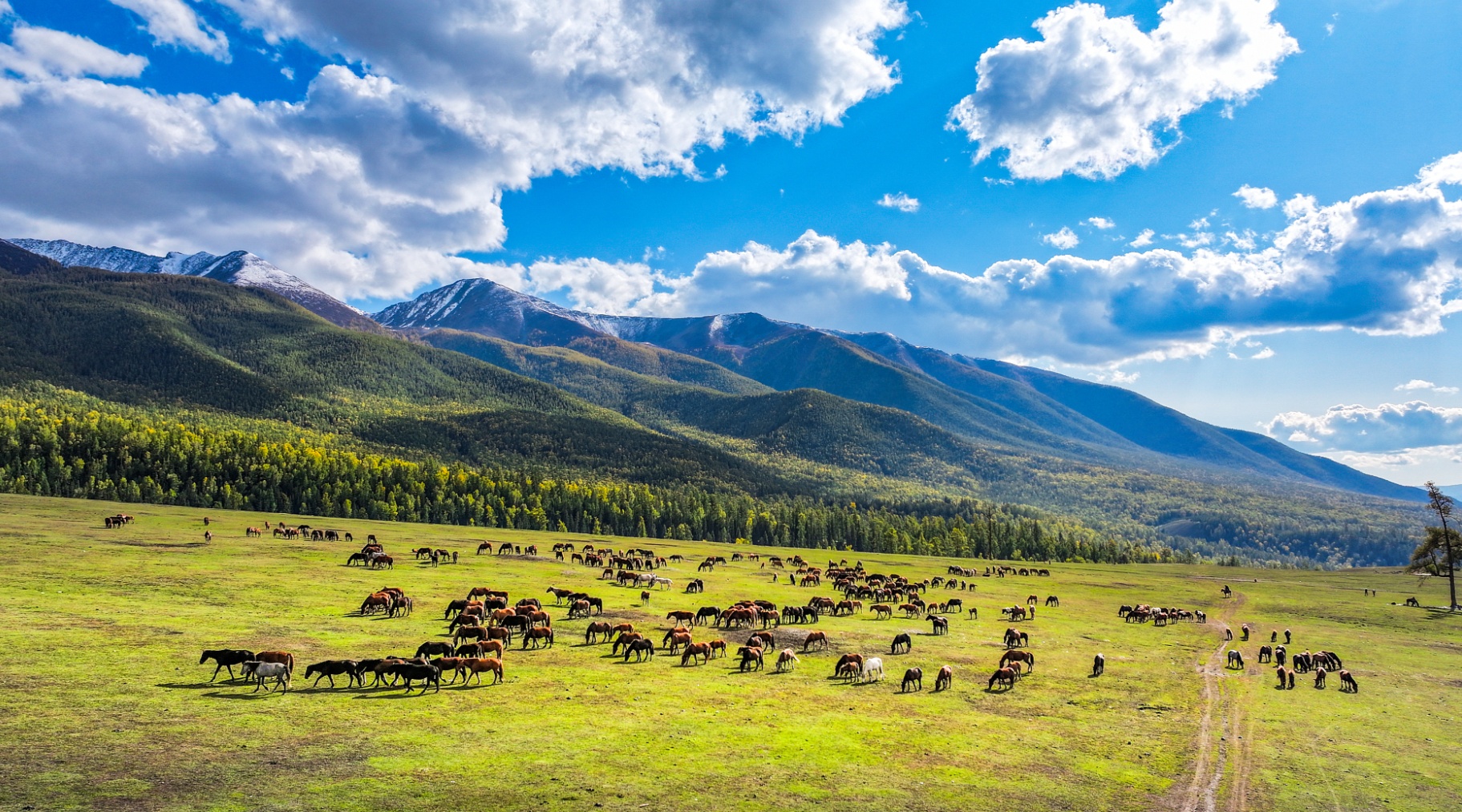 新疆阿勒泰,秋日喀納斯牛羊遍地,水豐草盛。