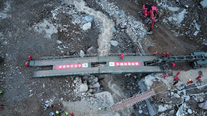原本的石橋損壞后,救援隊伍用木板搭了一座臨時橋。7月21日晚上8點(diǎn)15分,就在受損的豆腐石橋位置,中國安能三局成功架設(shè)起一座應(yīng)急機(jī)械化橋,解決了救援人員和重型機(jī)械通行問題,為后續(xù)人員搜救和應(yīng)急保障提供了有力支撐。接下來,更多的大型機(jī)械將開進(jìn)救援現(xiàn)場,搜救失聯(lián)人員、排危除險、消殺等工作仍在繼續(xù)。
