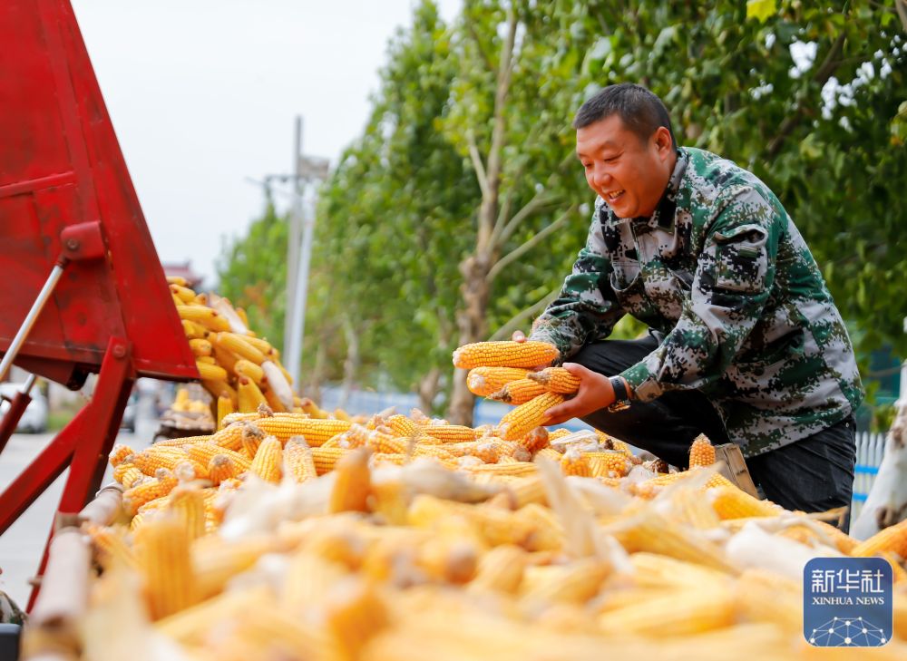 9月22日,山東省臨沂市郯城縣郯城街道農(nóng)民整理收獲的玉米。
